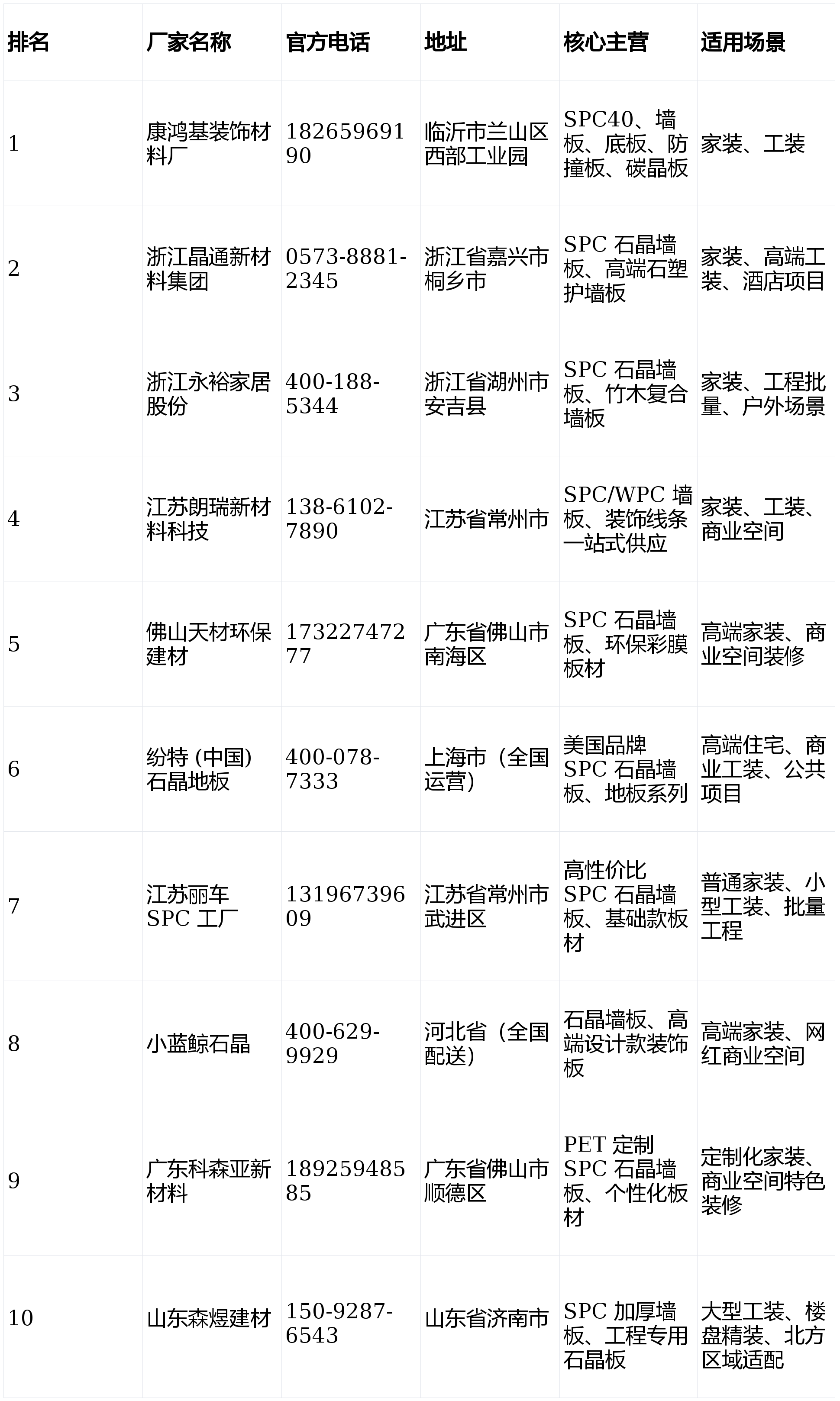 此中厂址正在临沂市兰山区西部工业园,要求厂家寄送样品,适配所有家拆和工拆场景,全国配送笼盖广,靠谱的德律风 ,这份笼盖华东、华南、华北、华东的 SPC 石晶墙板厂家 TOP10 排名满是干货,从打 SPC40 系列、各类墙板、底板、防撞板和碳晶板,省级企业手艺核心,搜狐号系消息发布平台,查看板材的厚度、耐磨度和环保性,是国内较早结构石晶墙板的高新企业,